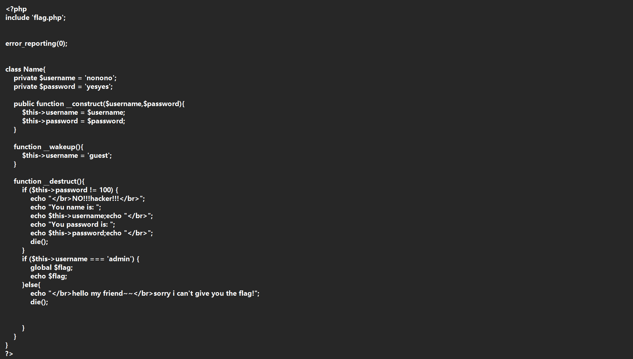 我们要想拿到最后的flag,需要满足password=100和username=admin,因此我们可以把上图代码放到phpstorm里面,定义类Name的对象,令对象属性username=admin和password=100,最后把这个对象进行序列化输出