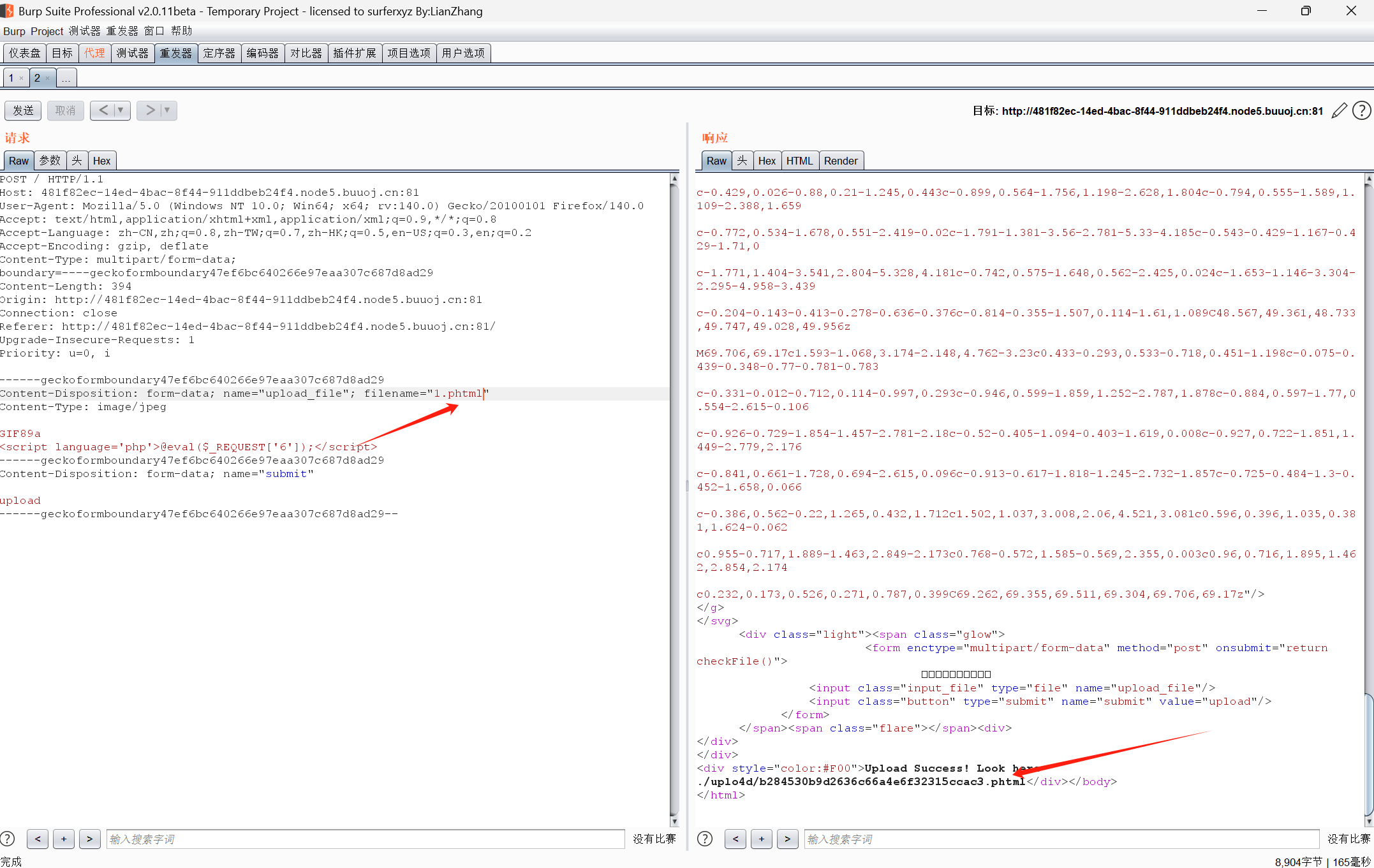 尝试上传一句话木马后缀名为phtml的文件,出现弹窗说只允许上传图片文件,推测是前端验证,因此修改后缀名为jpg,再上传,用burpsuite抓个包修改文件后缀为phtml重发