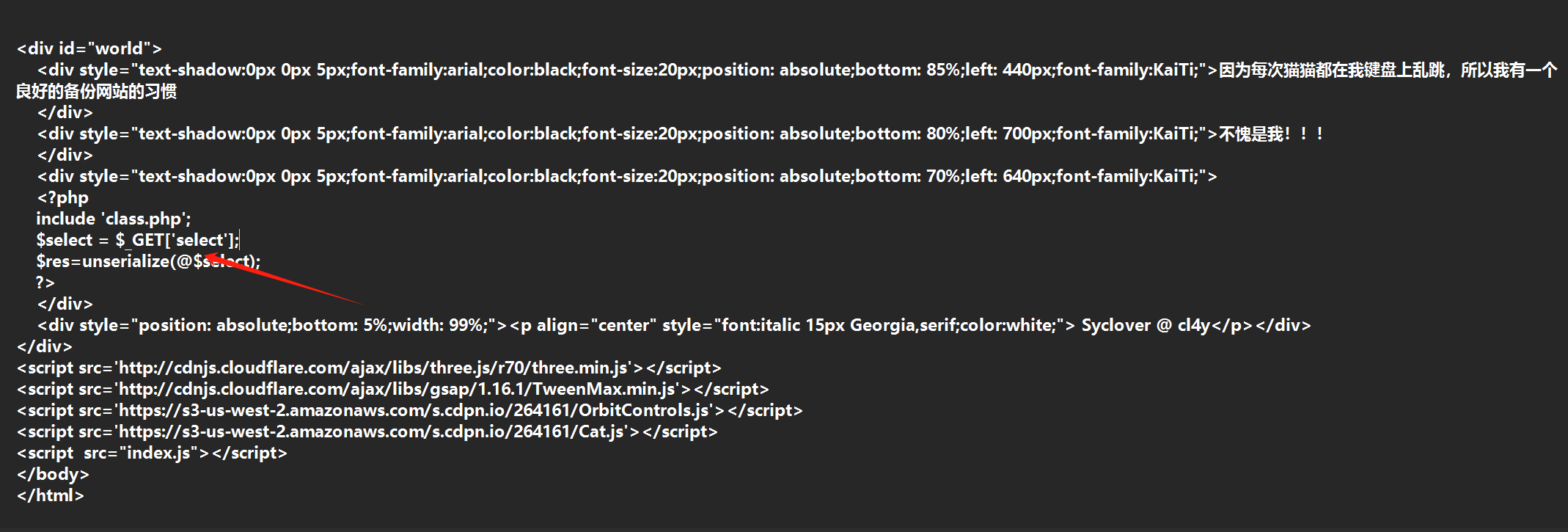 发现可以进行get传参,参数名为select,最后会传进来的参数进行反序列化,因此可以想到PHP的序列化和反序列化