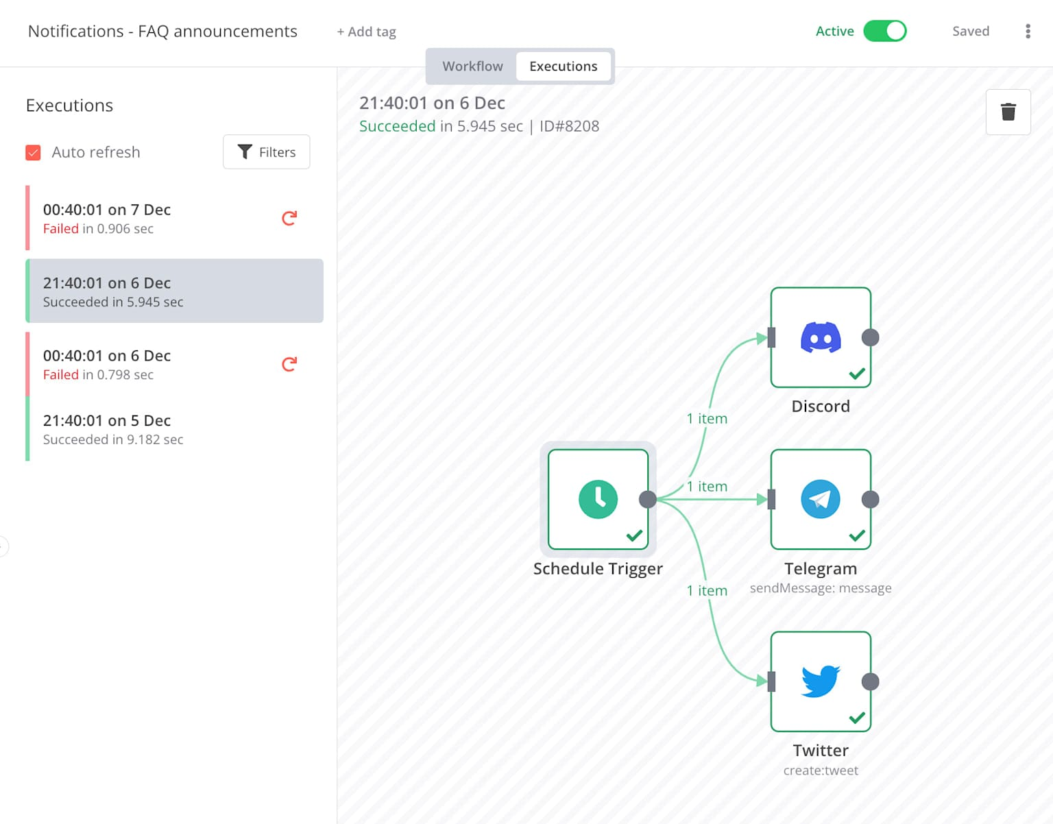 - 当触发条件满足时(时间到了、Webhook 被调用、收到新事件等),工作流会自动运行。4. 需要暂停时,再切回 **Inactive**,就不会再自动触发。