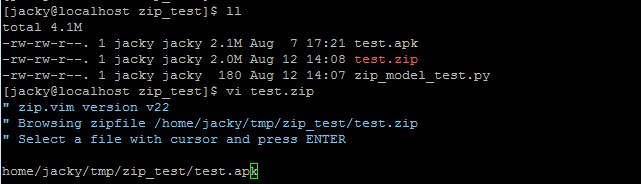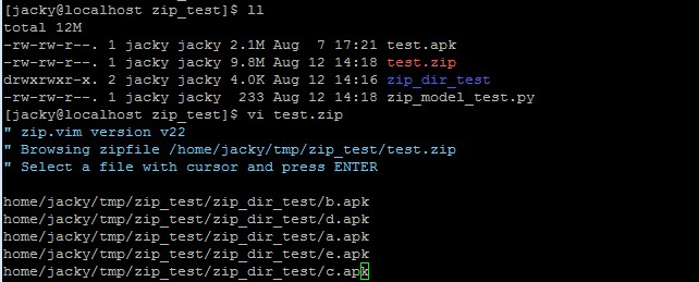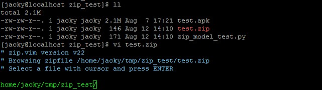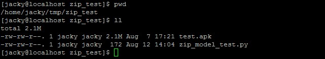 1 #!/usr/bin/env python 2 #coding:utf-8 3 4 import zipfile 5 6 file = '/home/jacky/tmp/zip_test/test.apk' 7 8 f = zipfile.ZipFile('test.zip', 'w', zipfile.ZIP_DEFLATED) 9 f.write(file) 10 f.close()