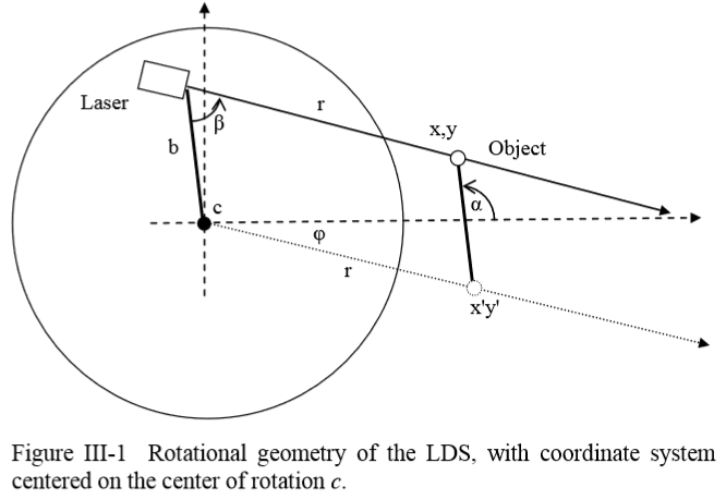 也就是说,雷达旋转起来后,测距的参考点与原来不转的测距模组的参考点不同。因此,我们需要对测距数据做一个公式(6)的换算处理。