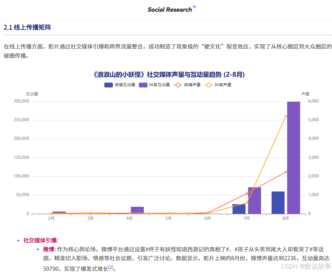 传统流程里,整理数据、画图表、搭框架、写结论步步耗时。而Social Research 搭载自研 Deep Research 框架,只需输入关键指令(如“电影《浪浪山小妖怪》全网社媒声量及其联名活动”),工具自动规划分析框架,20-30分钟内生成完整且专业报告。