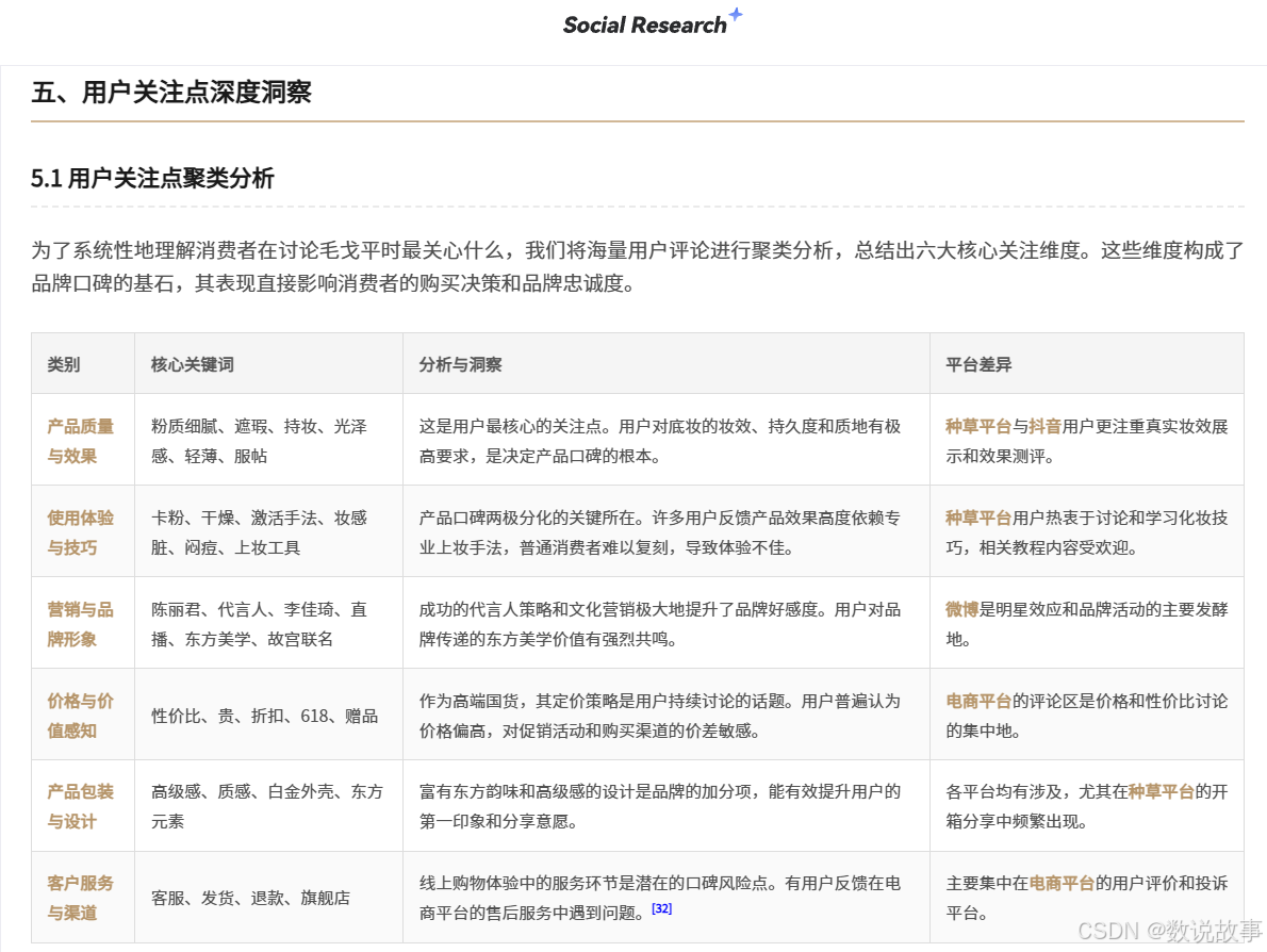 案例:在分析毛戈平品牌口碑时,“用户关注点深度洞察”,通过对海量用户评论进行聚类分析,总结6大核心关注维度,图表清晰到能直接截图放入提案,省去 90% 的 PPT 制作时间。