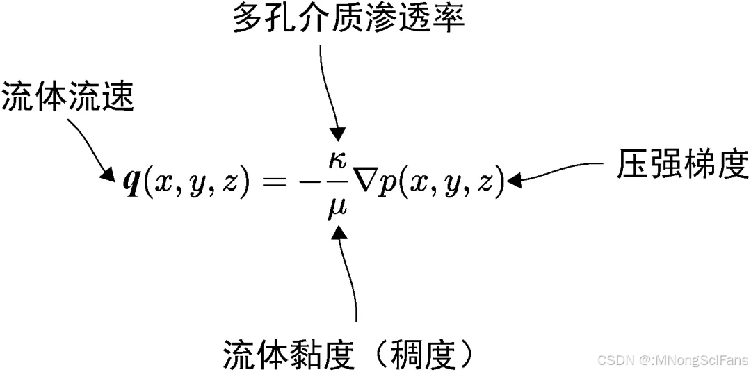 图为达西定律对应的物理方程,决定流体在多孔岩石中的流动方式,这个方程中最重要的部分是一个看起来像倒三角形的符号,它代表了向量微积分中的梯度算子(gradient operator)。压力函数p(x,y,z)在给定空间点(x,y,z)的梯度是三维向量q(x,y,z),表示该点压力增加的方向和速度。这里的负号表明,流速的三维向量指向相反的方向。这个方程用数学术语说明了,流体从高压区流向低压区。负梯度在物理定律中很常见。