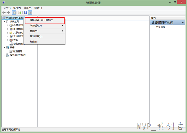 1. 打开计算机管理器(compmgmt.msc)右键根目录,选择【连接到另一台计算机】,输入服务器地址,如图: