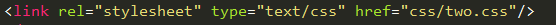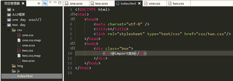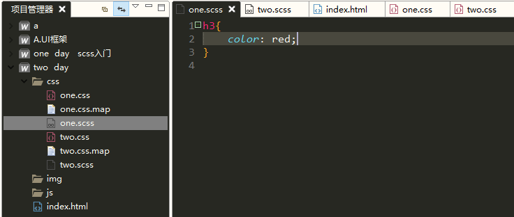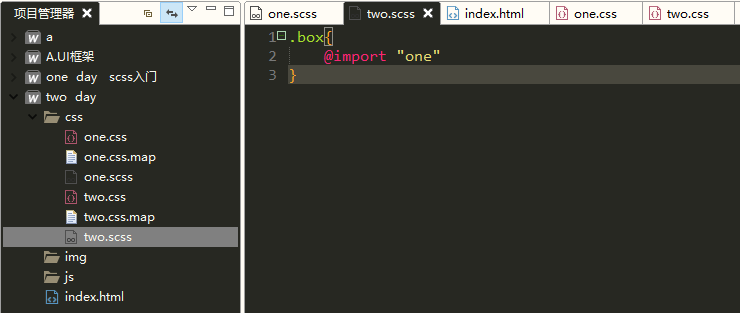 (3)在 html 中引入时要引入调用 one . scss 中的样式的 two . scss 文件生成的 two . css 文件