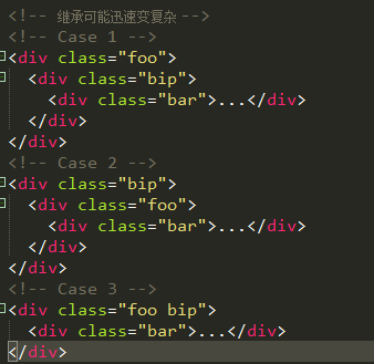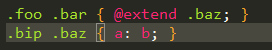 在上边的例子中,sass必须保证应用到.baz的样式同时也要应用到.foo .bar(位于class="foo"的元素内的class="bar"的元素)。例子中有一条应用到.bip .baz(位于class="bip"的元素内的class="baz"的元素)的css规则。当这条规则应用到.foo .bar时,可能存在三种情况,如下代码: