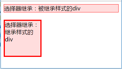 以上案例中 box2 继承了 box 中的所有样式,不仅拥有一个 3px 宽的红色边框,这个元素同时还会有一个浅红色的背景,因为这些都是在 box 中定义的样式 。
