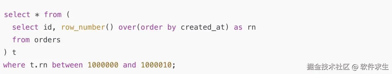 - 窗口函数:MySQL 8.x 支持窗口函数,我们可以用 row_number() 给结果集编号,然后取某一段: