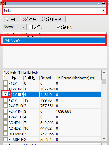 方法三:另外,右下角panels--》PCB--》双击ALL Nets--》去勾选左侧的对勾--》就可以不显示网络的颜色。