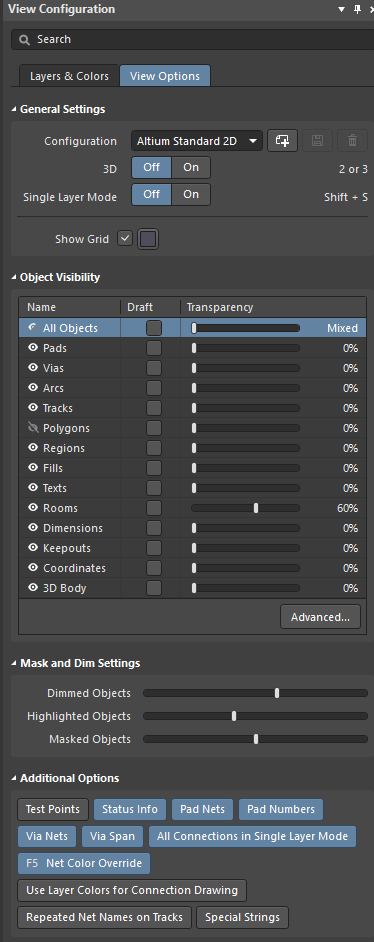 布线网络默认是显示为其所在图层的图层颜色,要显示网络颜色则需要如上图所示,勾选网络以启用网络颜色。如果勾选后没有显示网络颜色,可以按下快捷键 F5 全局启用 / 禁用网络颜色显示,或在右下角 Panels 调出 View Configuration 面板,然后在 View Options 标签中使用F5 Net Color Override 按钮启用 / 禁用网络颜色显示(其实和快捷键的效果是一样的,还不如F5来的方便)。