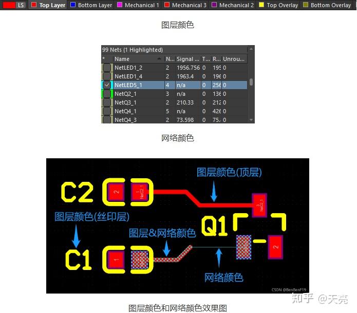 在 PCB 编辑器中,一个网络有两个颜色设置;图层 (layer) 颜色和网络颜色。