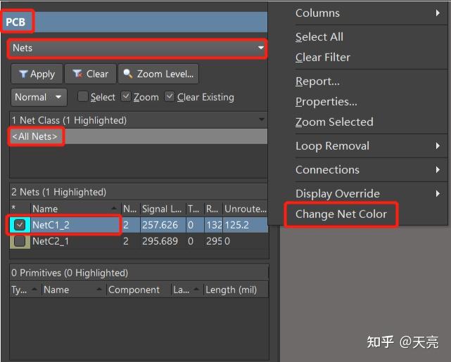 在 PCB 编辑器的 PCB 面板中 (如果没有此面板,左下角 Panels 可以调出) ,选择 Nets 模式,点击 All Net 显示所有网络,右键单击选定的网络并选择 Change Net Color 命令可以设置网络颜色。