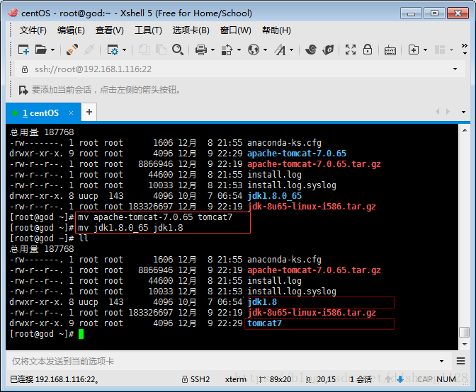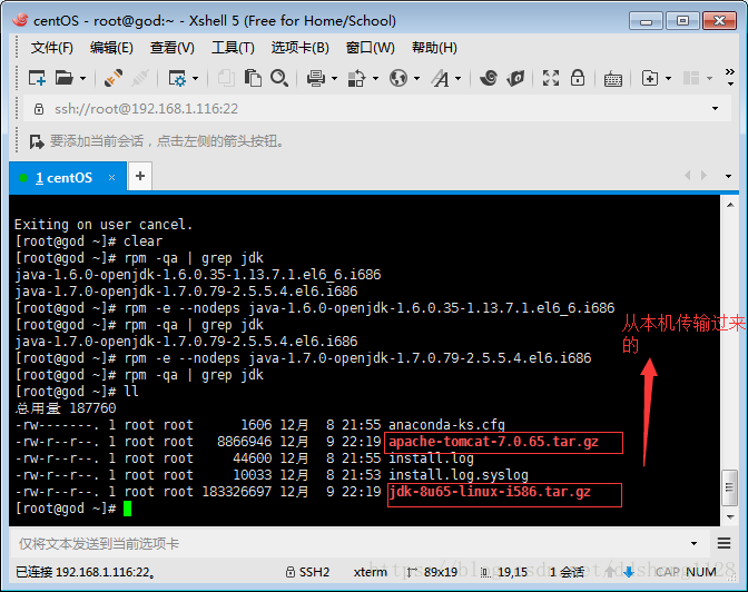 利用Xftp上传jdk和tomcat的压缩文件,当然可以直接在linux直接下载,我之所以这么写,是为了以后的工作需要,因为以后大家操作linux系统很有可能没有界面,甚至在远端!如下图