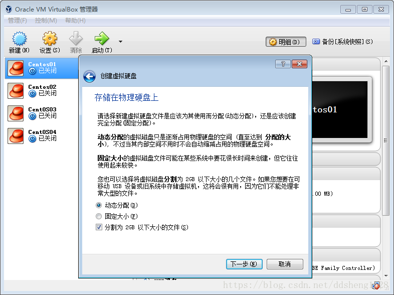 点击下一步,虚拟硬盘的存储方式,选择动态分配,并将分割为2GB大小的文件复选框勾上,优点已经写明,大家可以细看下,不要下一步、下一步就过了