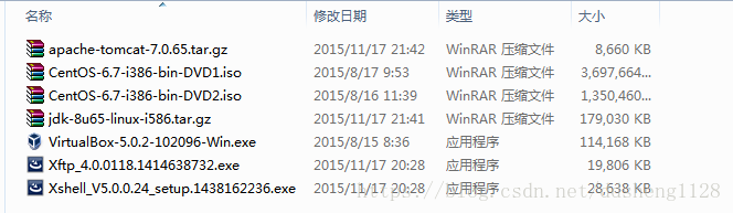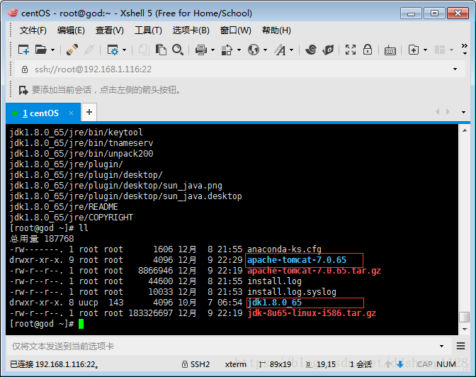 直接解压jdk和tomcat,用命令tar -zxvf 压缩文件名(tar -zxvf jdk-8u65-linux-i586.tar.gz,Tab键在命令行下有补全作用,不要太认真,去敲全名哦!例如,输入tar -zxvf jd按Tab键,jdk的压缩文件名就会补全了),两个压缩文件都解压后,如下图