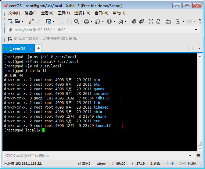 将这两个文件夹移动到/usr/local/下,不移动也是可以的,只是linux文件夹有默认的意义,具体每个文件夹存放些什么内容,不在本博客讲解的范围内,大家自行去补脑linux,如下图