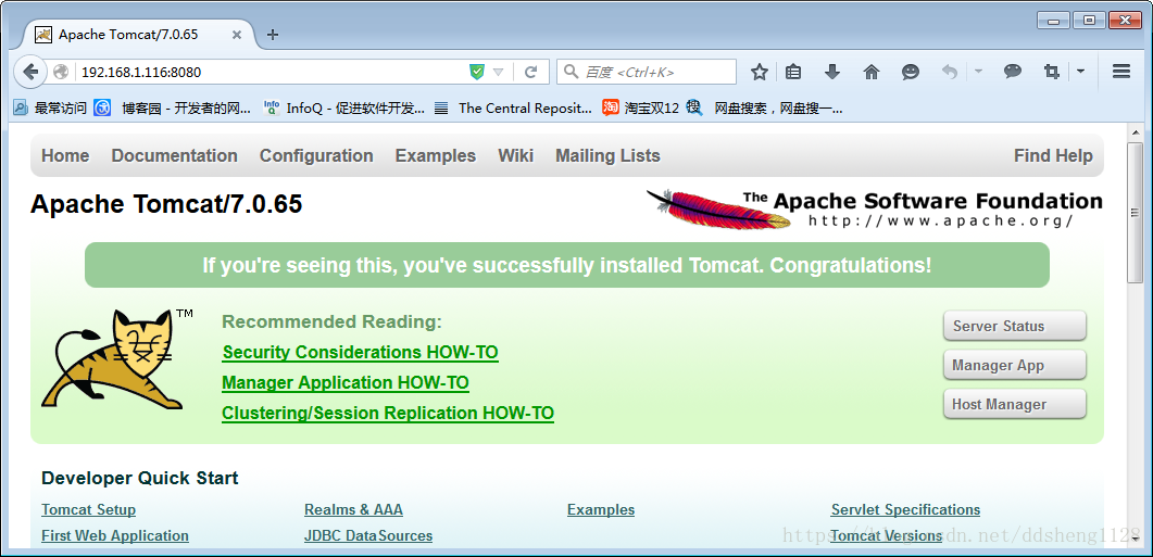tomcat启动成功,我们去浏览器访问下,如下(外部访问的时候记得关闭192.168.1.116的防火墙:service iptables stop)