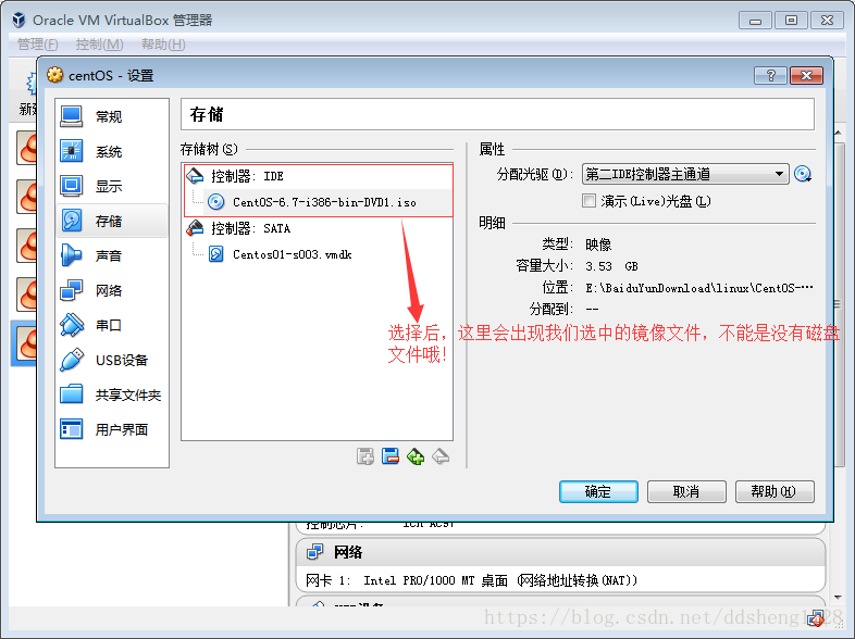 存储设置中,需要将我们下载的centos镜像文件导进来,点击分配光驱最右边的那个光碟图片,选择我们下载的镜像文件,如果镜像文件分两个,那么选择DVD1,如下图