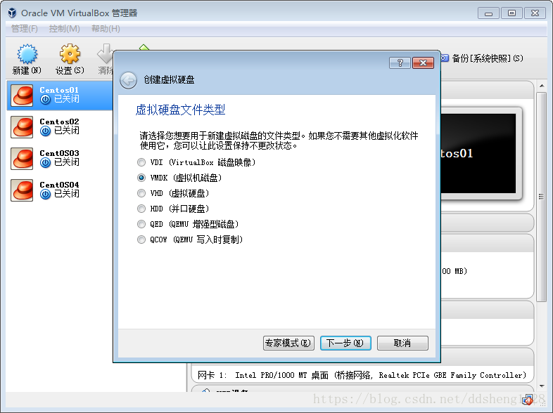 点击创建后,选择虚拟硬盘文件类型,选择vmdk类型,他是虚拟机通用类型,其他的虚拟机也能解读,方便日后移动,如下图