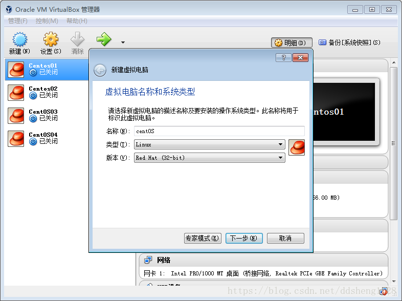 启动VirtualBox,点击新建,输入虚拟机的名称,选择linux和Red Hat,如下图