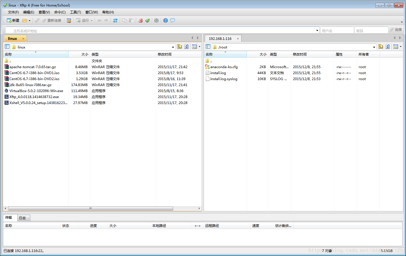 打开Xftp,如下图,就可以进行左右两边的互相拷贝了