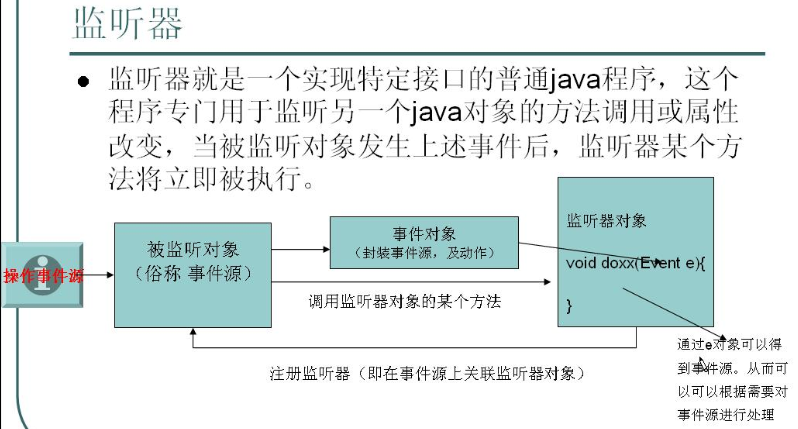 我们平时做开发的时候,我们是写监听器去监听其他对象,那么我们如果想设计一个对象,让这个对象可以被别的对象监听又该怎么做呢,可以按照严格的事件处理模型来设计一个对象,这个对象就可以被别的对象监听,事件处理模型涉及到三个组件:事件源、事件对象、事件监听器。