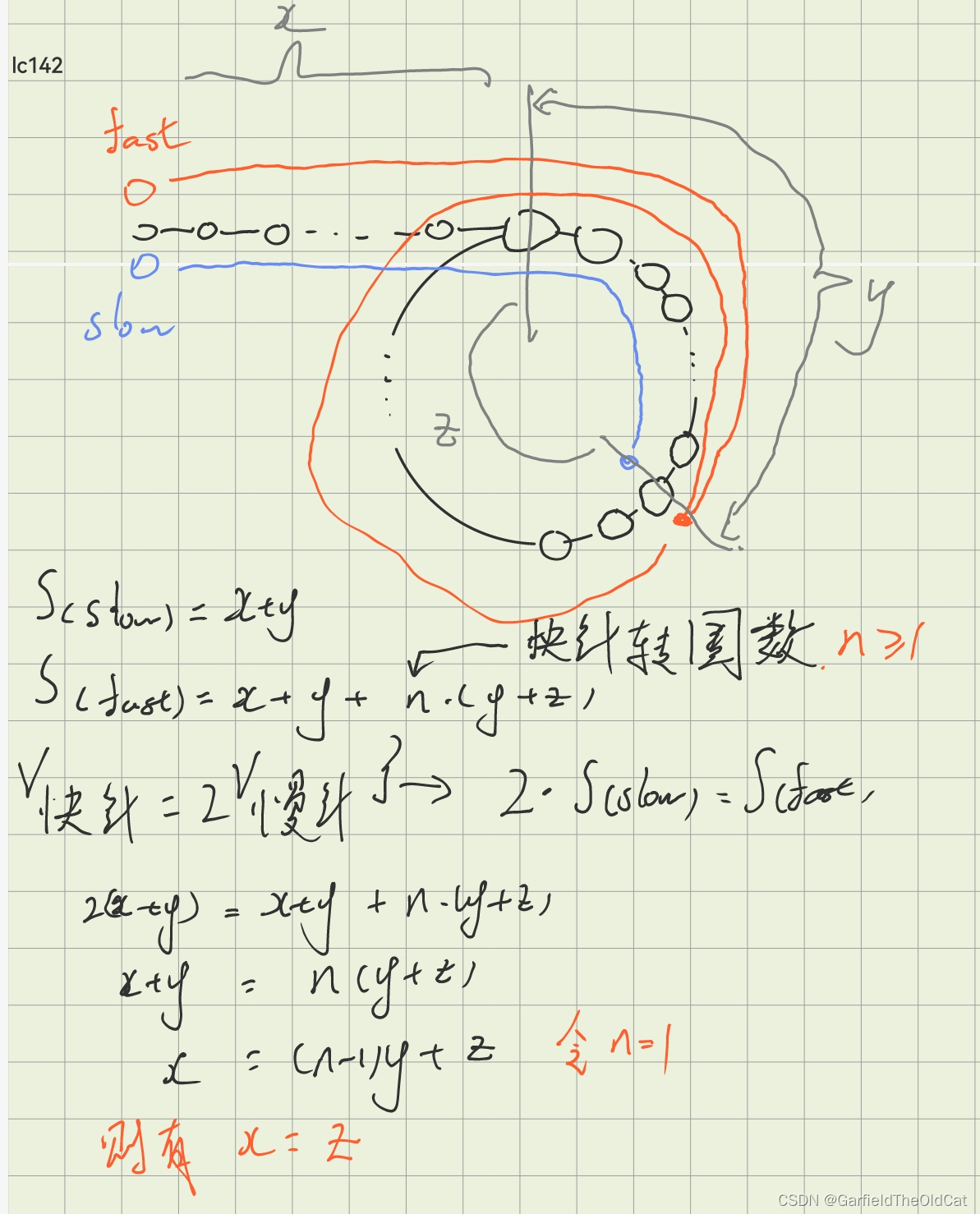由图可知,从head到入口和从交点到入口的节点数是相同的,因此只要用两枚指针从这两个地方开始遍历链表,两枚指针相遇的地方就是入口。