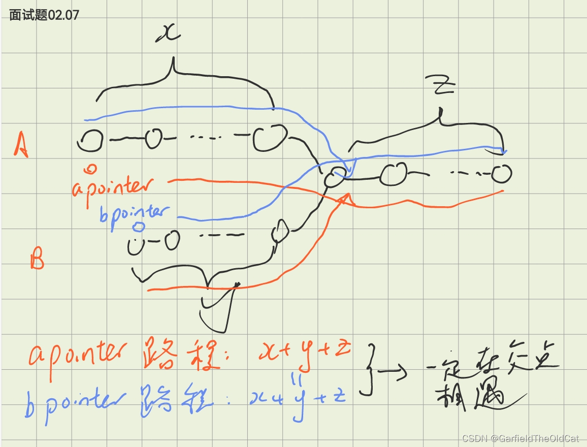 - 移动a链表指针apointer到第delta个节点,bpointer到headB,对其两个链表