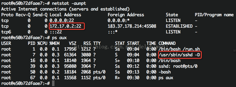 此时查看容器的22端口(SSH服务器默认监听的端口),已经处于监听状态: