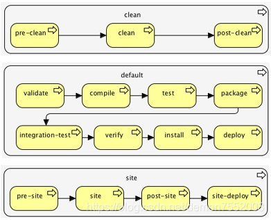 从命令行执行maven任务的最主要的方式就是调用maven的生命周期阶段(phase)。各个生命周期是独立的,每个生命周期指定一个阶段(也可不指定),一个生命周期的阶段是前后依赖的,此阶段前的所有阶段都会顺序执行。