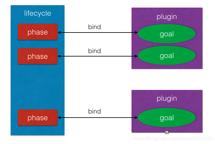 maven核心仅定义了抽象的生命周期阶段,具体任务由插件完成。一个插件可能有很多功能,某个功能就叫一个目标(goal)。例如: