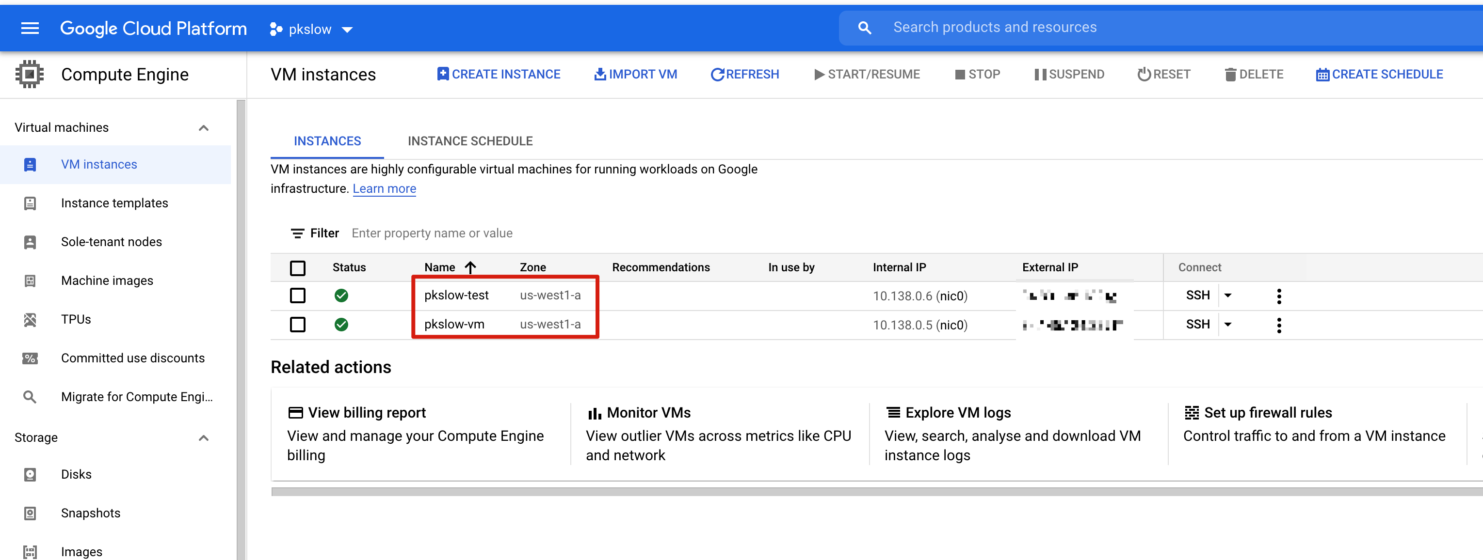 Created [https://www.googleapis.com/compute/v1/projects/pkslow/zones/us-west1-a/instances/pkslow-vm].