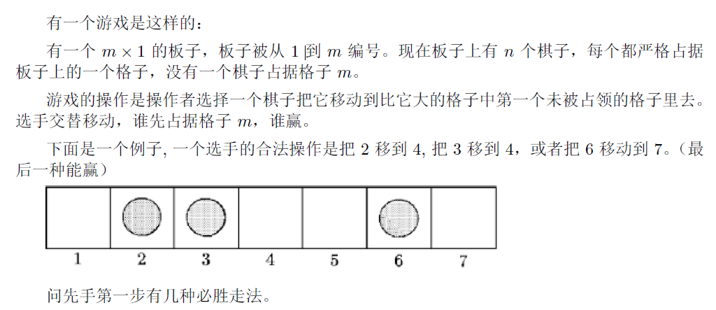 #include<bits/stdc++.h> #define N 1000009 using namespace std; int el[N],c[N],p[N],ed,pa,n,m,siz[N],a[N],alc,anp,ans,x; int get(int x){ return ((el[x+1]&1)&&(el[x]-el[x+1]==1))?siz[x+1]:0; } signed main () { // freopen("a.in","r",stdin); scanf("%d%d",&m,&n); for (int i=1;i<=n;i++) scanf("%d",a+i); sort(a+1,a+n+1); for (int i=1;i<=n;i++) { if (c[ed]!=a[i]) { p[++ed]=a[i]; c[ed]=a[i]+1; } else c[ed]++; } if (c[ed]==m) return printf("%d\n",c[ed]-p[ed]),0; pa=m-2; for (int i=ed;i;i--) { alc+=max(pa-c[i],0),pa=p[i]; el[i]=alc; siz[i]=c[i]-p[i]; anp^=(el[i]&1)*siz[i]; } for (int i=ed;i;i--) { if (!el[i]) continue; if (el[i]&1) ans+=(anp^siz[i])<siz[i]; else { x=get(i); // assert(x==0); ans+=(siz[i]+x>=(x^anp)&&x<(x^anp)); // cerr<<siz[i]<<' '<<x<<endl; } // ans+=((anp^x)<=x+siz[i])&&((anp^x)>x); // cerr<<siz[i]<<' '<<el[i]<<endl; } printf("%d\n",ans); return 0; }