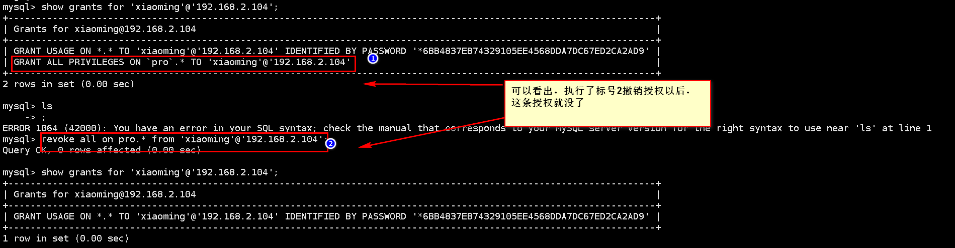 20,查看授权给xiaoming的权限和撤销权限。