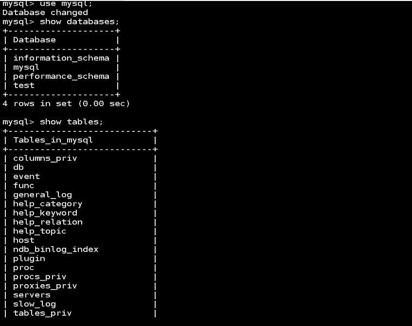 5,进入nysql库,并查看mysql库中的所有表格。