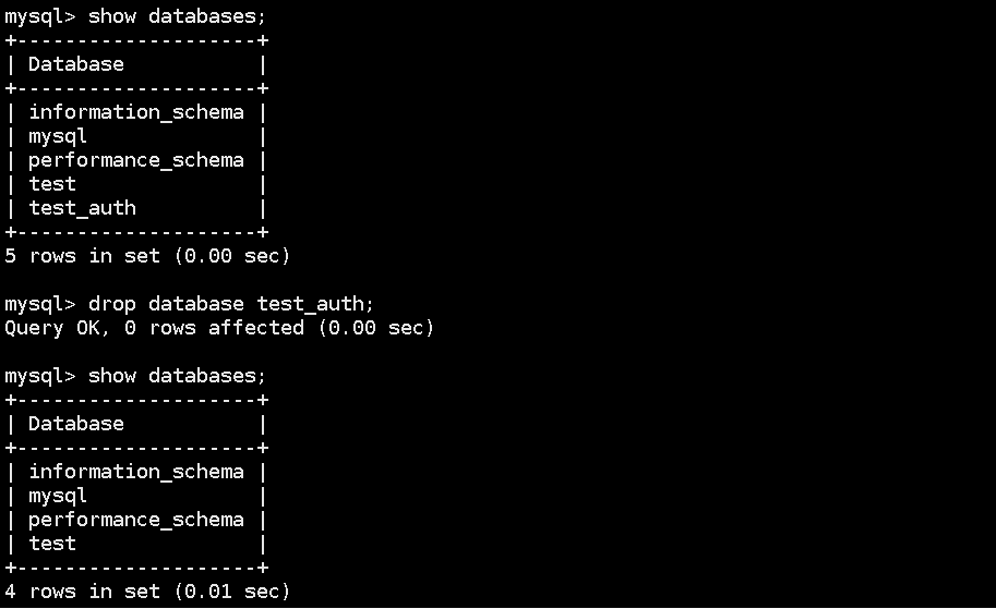 10,删除一个库test_auth,再次查看已经没有了。