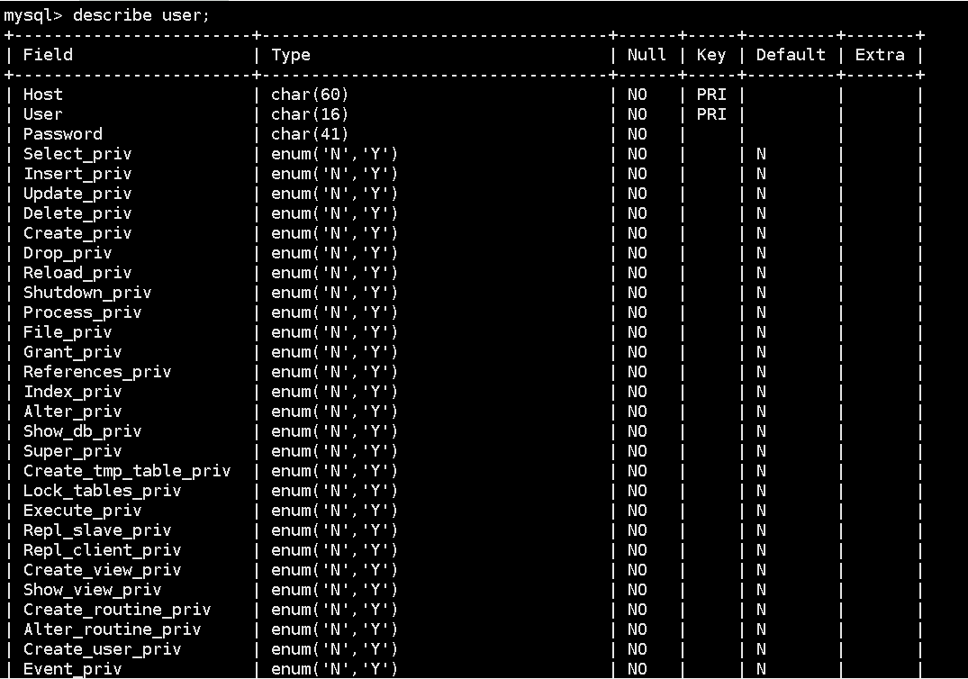 6, 查看mysql库中user表格的结构。