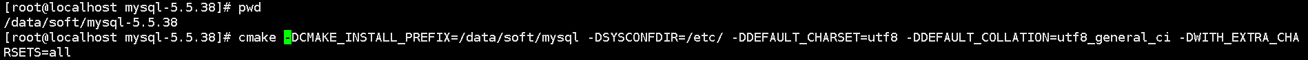 cmake -DCMAKE_INSTALL_PREFIX=/data/soft/mysql -DSYSCONFDIR=/etc/ -DDEFAULT_CHARSET=utf8 -DDEFAULT_COLLATION=utf8_general_ci -DWITH_EXTRA_CHARSETS=all