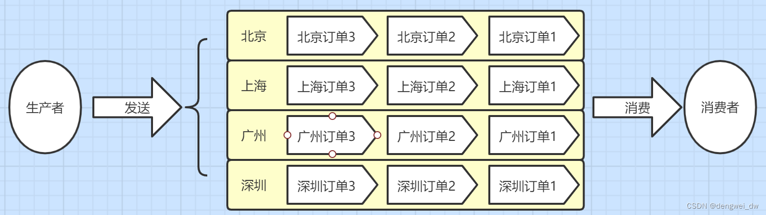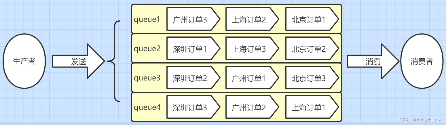 这个时候思路就来了,我们让不同的地区用不同的queue,只要保证同一个地区的订单把他们放到同一个Queue那就保证消费者先进先出了。