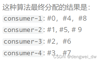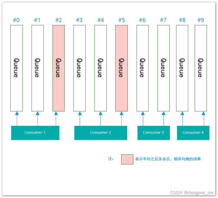按照上述例子来看,10/4=2,即表示每个消费者平均均摊2个queue;而10%4=2,即除了均摊之外,多出来2个queue还没有分配,那么,根据消费者的顺序consumer-1、consumer-2、consumer-3、consumer-4,则多出来的2个queue将分别给consumer-1和consumer-2。