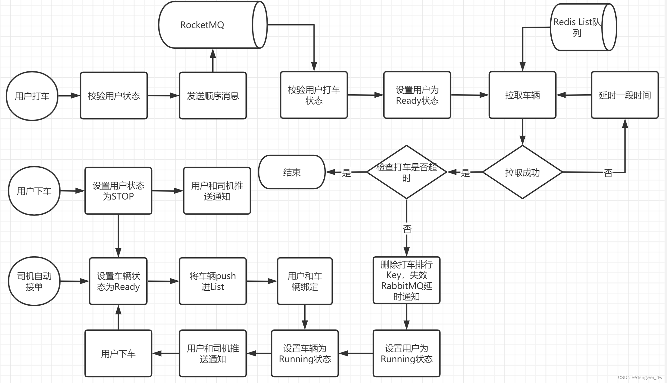 - 拉取到后校验是否超时,如果超时直接结束打车,否则删除RabbitMQ的超时检测Key,失效超时通知