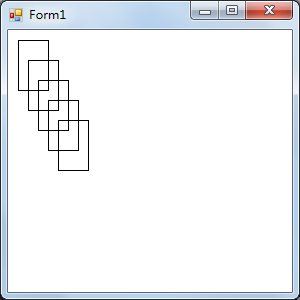 private void Form1_Paint(object sender, PaintEventArgs e) { Graphics g = e.Graphics; g.FillRectangle(Brushes.White, this.ClientRectangle); for (int i = 1; i <= 5; ++i) { //first,draw a rectangle with the current translation g.DrawRectangle(Pens.Black, 10, 10, 30, 50); //add a translation to the existing transformation g.TranslateTransform(10, 20); }