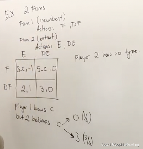 Player 1是一個市場上已經存在的公司,Player 2是一個正在決策是否進入市場的公司。Player 1有一個Private type數據c被世人知道有兩個可能的值,0或3,但只有Player 1確切知道實踐中是哪個值,Player 2不確切知道Player 1實際中是哪個值,Player 2 make a belief,believes 兩個值的概率分佈是1/4概率取值0,3/4概率取值3。