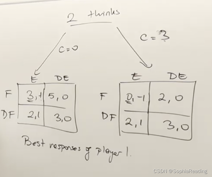 首先,Player 1在c=3時,有dominating strategy DF。我們計算Player 2的Best Reponse。先Fix Player 1的strategy,那麼有兩個case。Case I,Player 1的strategy是,即