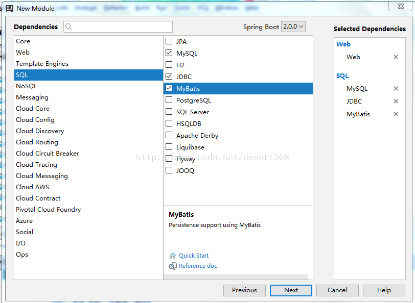 1.3: 下一步,选择 Web和Mysql(数据库)还有就是JDBC和Mybatis(到时候会自动把你的依赖引进去)
