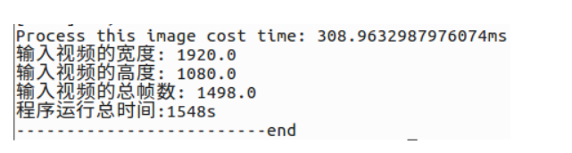 表示程序运行完成,处理一帧大概需要300ms,比较慢,分析可知,主要是读取视频和后处理较慢,推理速度挺快的,后期可能要对后处理做优化,比如使用算子完成后处理,或者硬件解码视频,使用OpenCV读取视频应该不较慢,而且图像质量感觉一般。