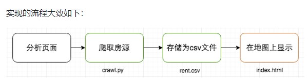 实验中会用到三个文件:crawl.py、rent.csv和index.html,其中rent.csv由crawl.py生成,是房源文件,crawl.py是一个非常简单的爬取网页的脚本,index.html是最重要的显示地图的部分。