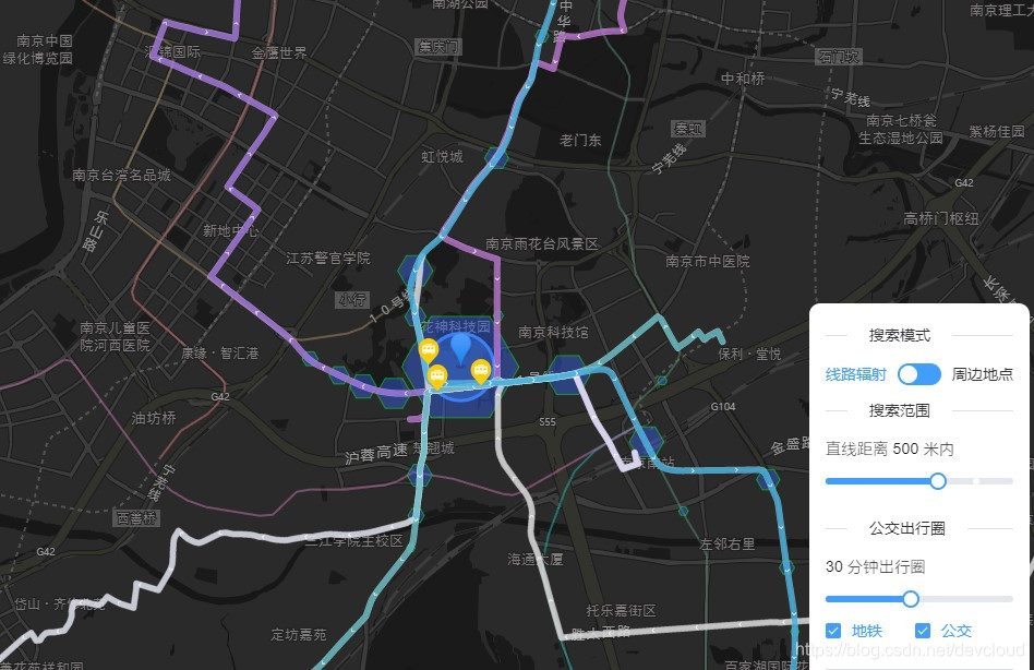 最后,再顺便安利一个公交辐射地图https://bus.daibor.com/,可以定位查询直达公司的公交线路,顺着图中的彩色线条,或许也能发现性价比高的的房源。